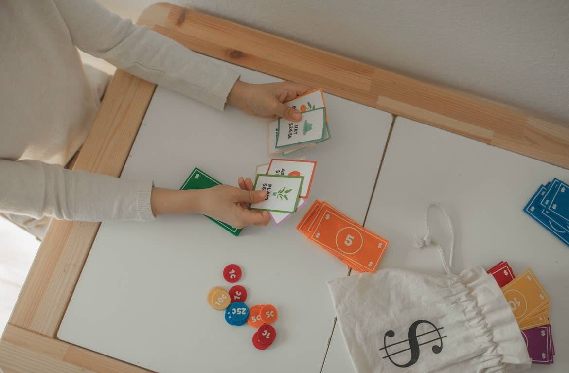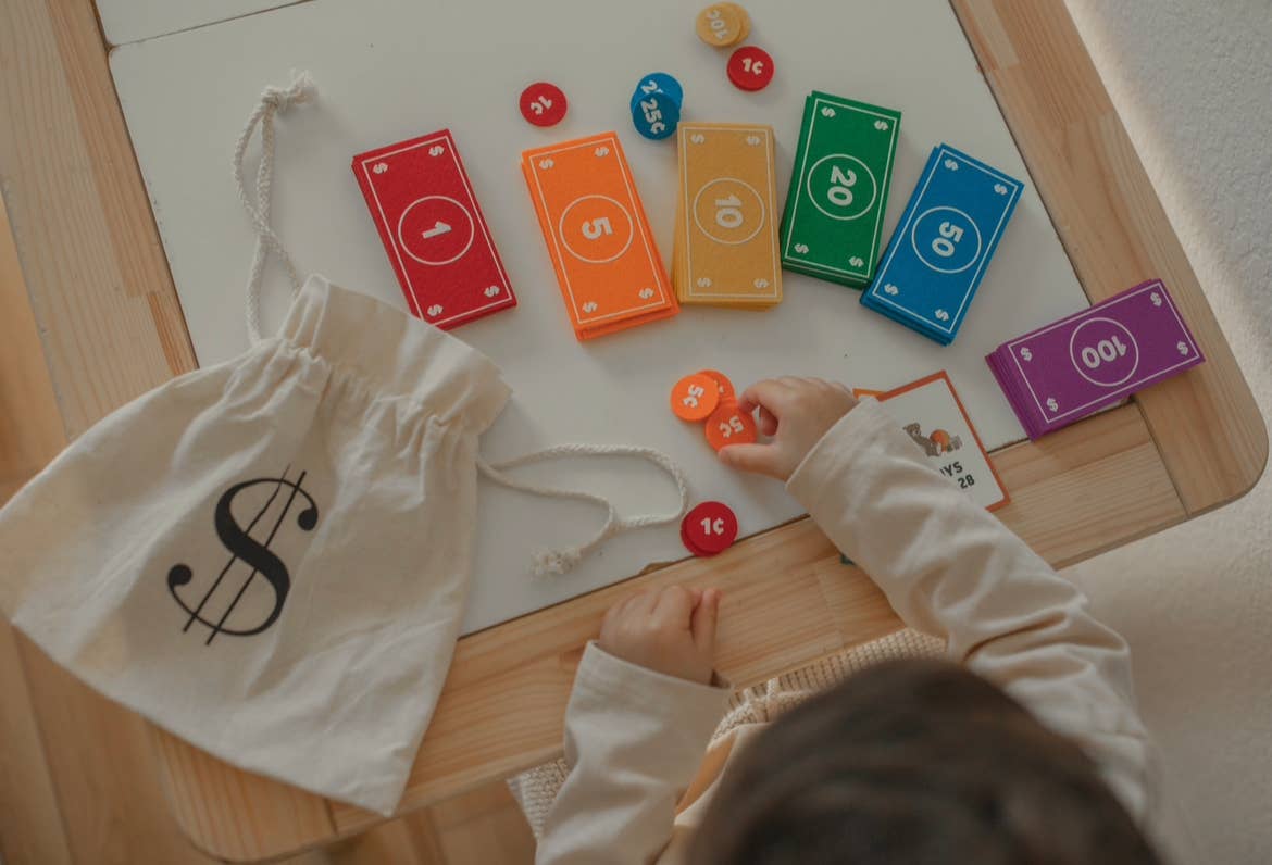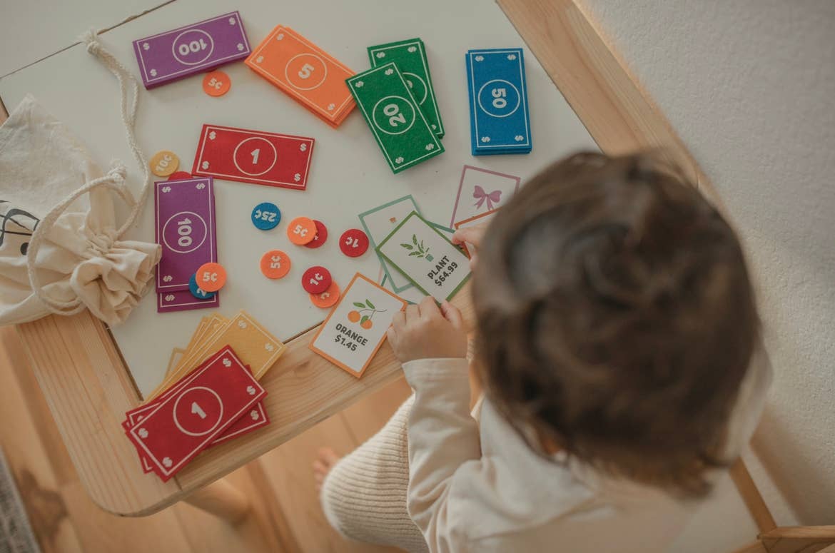 SET INCLUDES: (5) - $1, $5, $10, $20, $50, $100 bills - [ 2” x 4” ] (5) - 1¢, 5¢, 10¢, 25¢ coins - [ 1” ] (8) - double-sided flashcards - [ 2” x 3” ] (1) - cotton drawstring storage baggy Kids can pretend to buy and sell items just like their parents with the fun rainbow Felt Money Set. This beautifully designed pretend play set is packed with cash bills, coins, as well as flashcards that motivate the child to add up their total to buy what they wish! The coloring is bright and fun for kiddos to really extend the pretend play for hours. Pretending to buy food, clothes and toys helps kids gain counting skills, money management experience, as well as a sense of responsibility and independence. This Felt Money Set includes 58 pieces that are perfectly sized for children and fit well in toy cash registers!