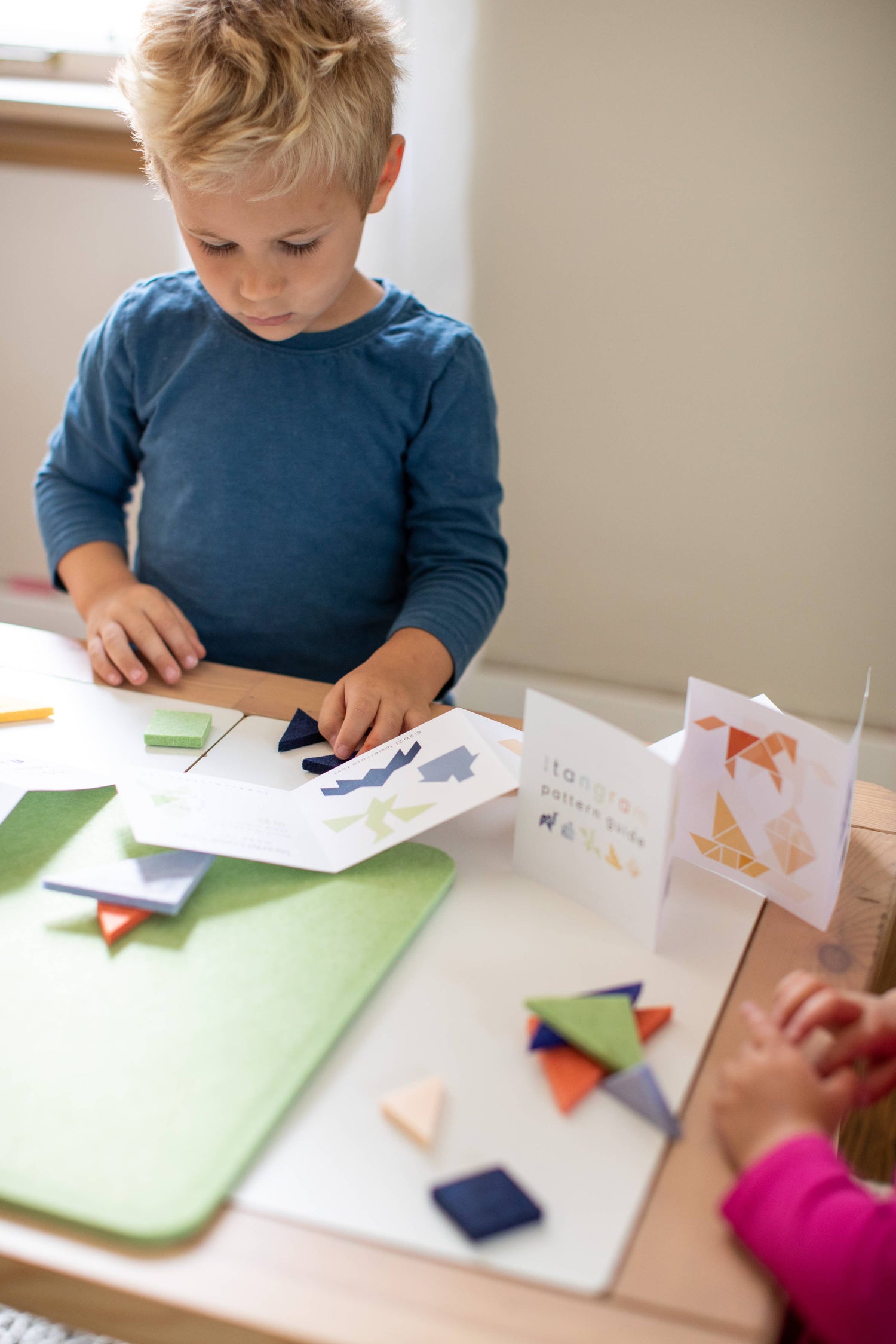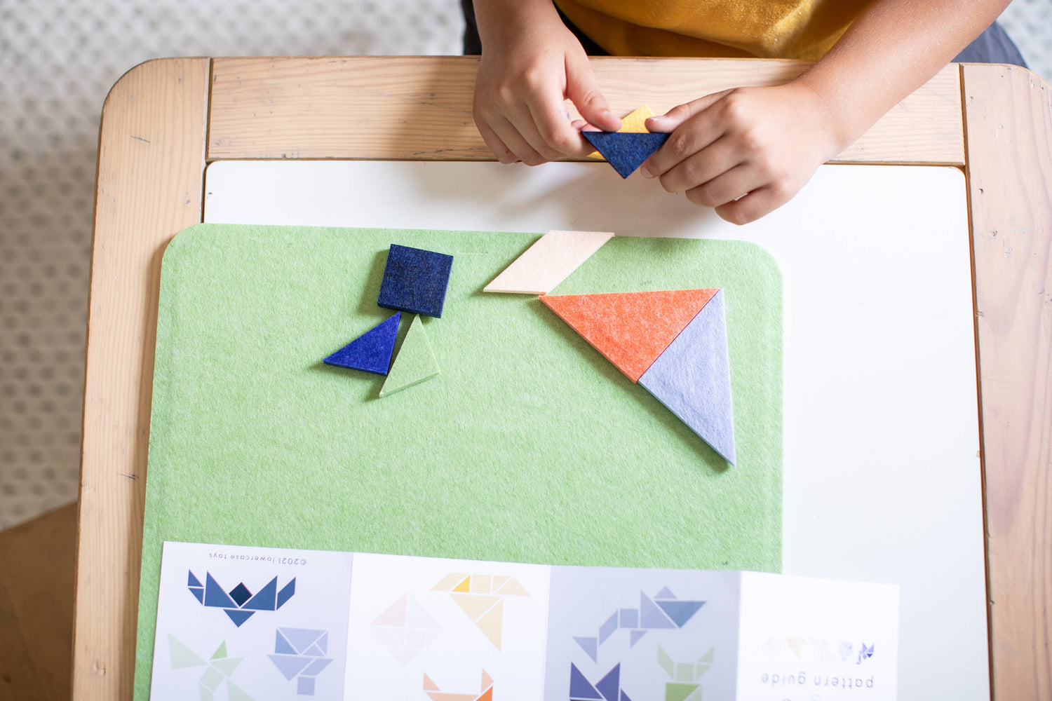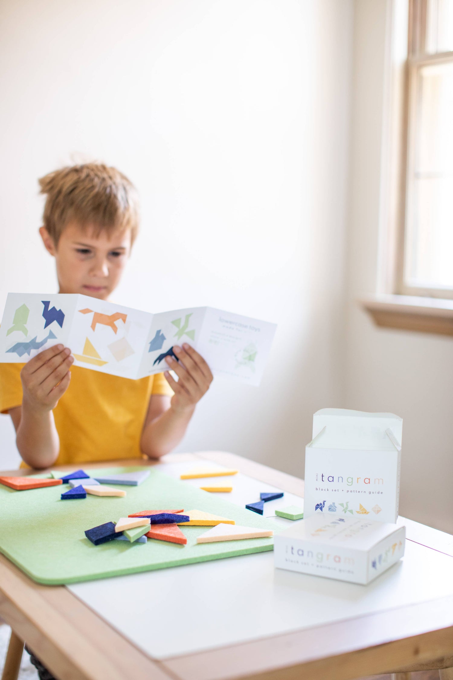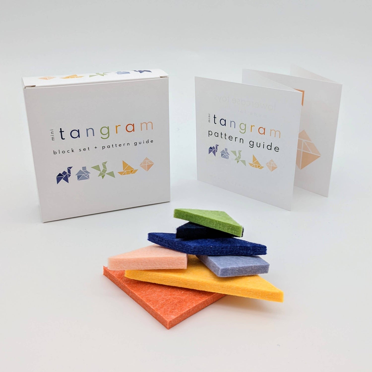 This mini felt block version of tangrams makes packing independent play easy. Perfect for on-the go play, this compact version of the classic spatial-problem solving puzzle is ready to go anywhere.