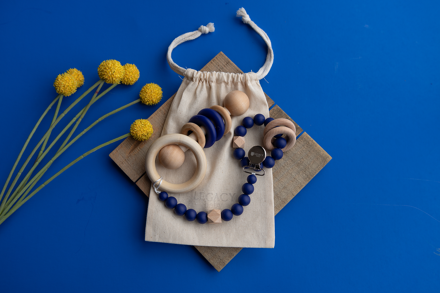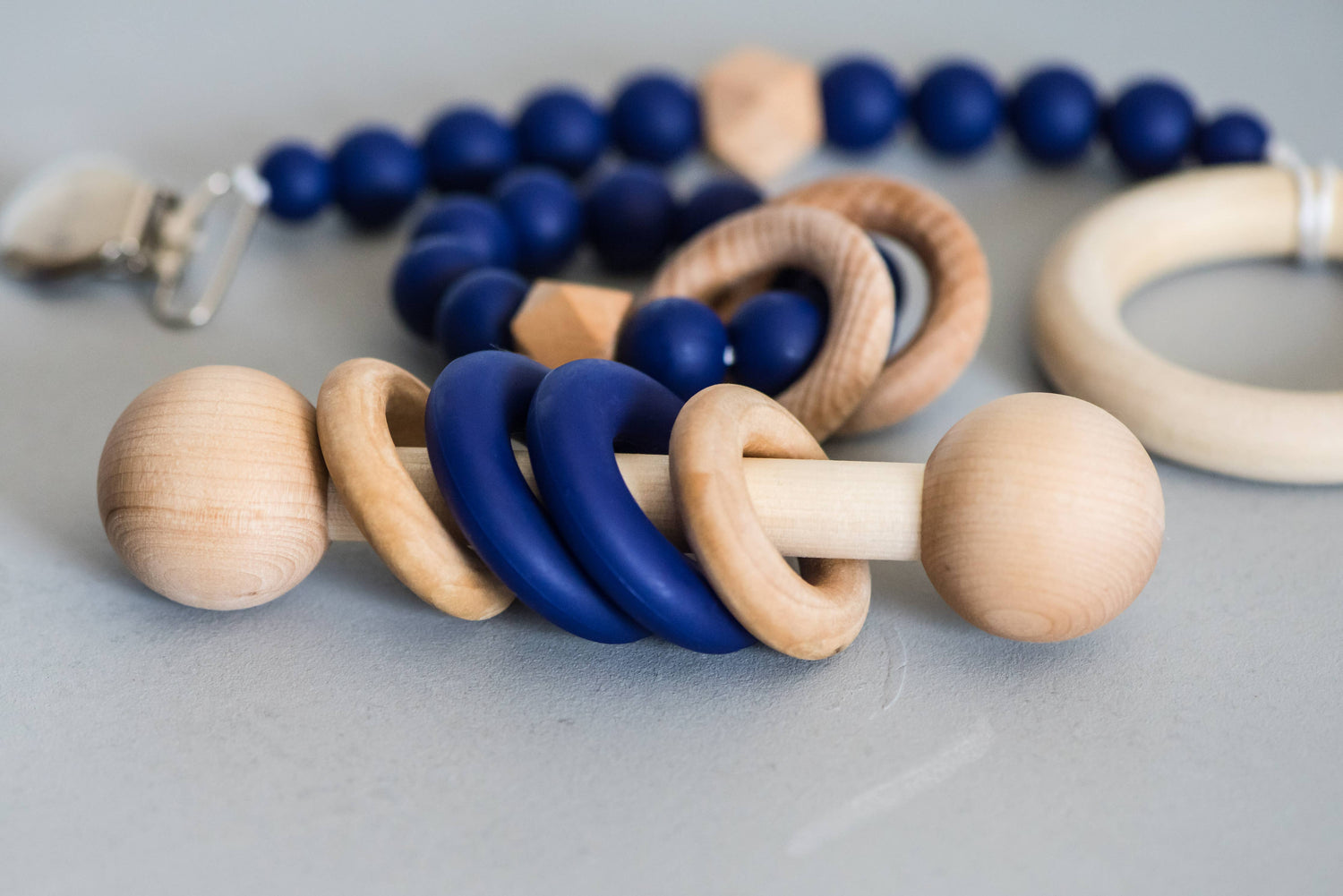 (1) Wooden Magic Rattle (5 1/2" long), coated in our handmade beeswax and jojoba oil wood finish, with 2 navy blue silicone teething rings and 2 wooden teething rings.
