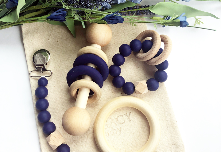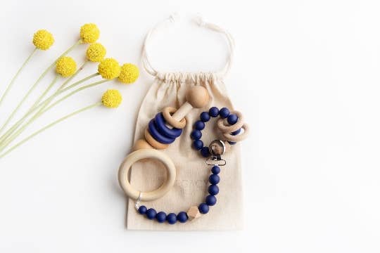 Give the ultimate gift of handmade play with this pairing of our handmade wooden rattle, teething toy, silicone paci/toy holder, and wooden teething ring.