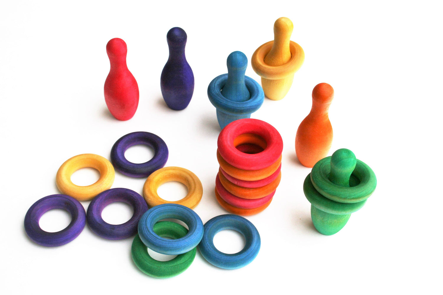 Set includes: (6) Colored wooden bowling pins - 2 11/16" tall (18) Corresponding colored wooden rings- 1 1/2" diameter (1) Cotton drawstring bag for storage