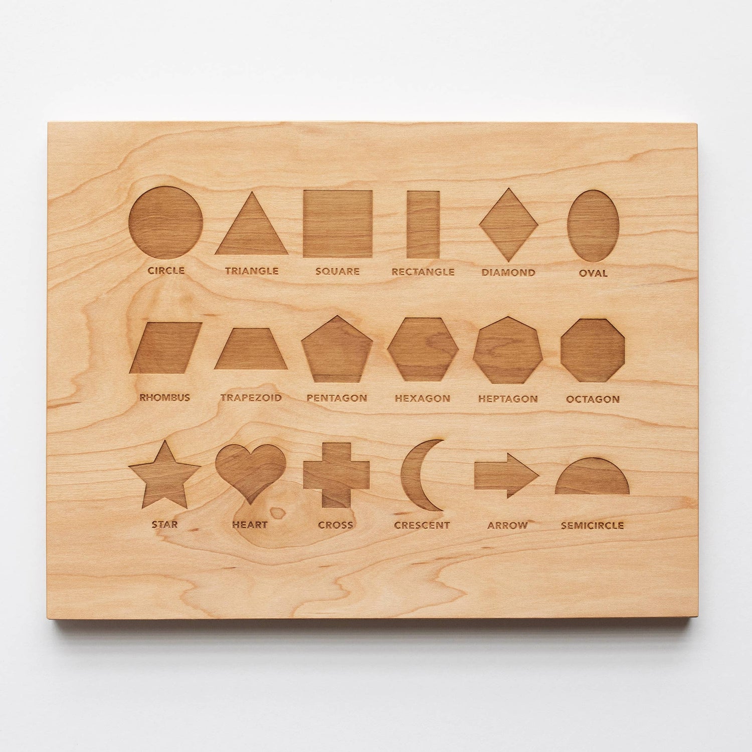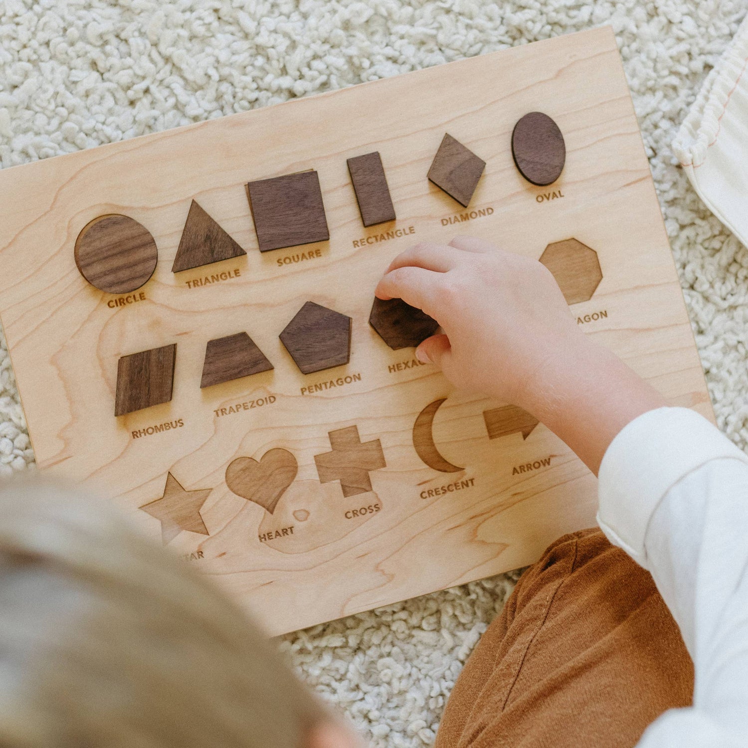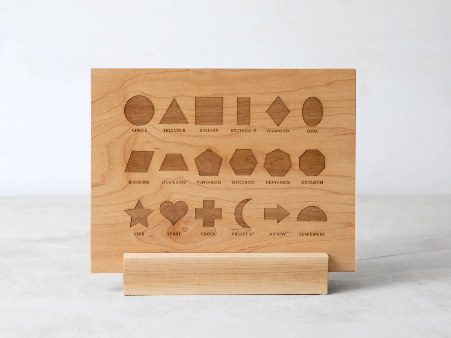 Our handmade wooden shapes board with coordinating wood shape pieces is designed with multiple uses in mind - as a matching activity & puzzle for little hands, shape pieces for geometry practice, tracing, and exploration, & as an art display. Inspired by Montessori-style natural materials, this engraved board allows children to trace their fingers in the grooves of the wood & feel each shape while absorbing the beauty of each form in this crisp, clear, easy-to-read chart. Our design features 18 basic shapes and their corresponding names, and all 18 shapes cut out in contrasting walnut wood pieces INCLUDES: • Shapes Board • 18 Shape Pieces in a Cotton Bag Crafted by hand their our Ohio studio from locally sourced wood. Sealed with food-grade mineral oil and safe for babies & children to enjoy. Made from plywood, maple, & walnut woods. Each item is unique and made-to-order; wood tone & grain will vary from piece to piece.