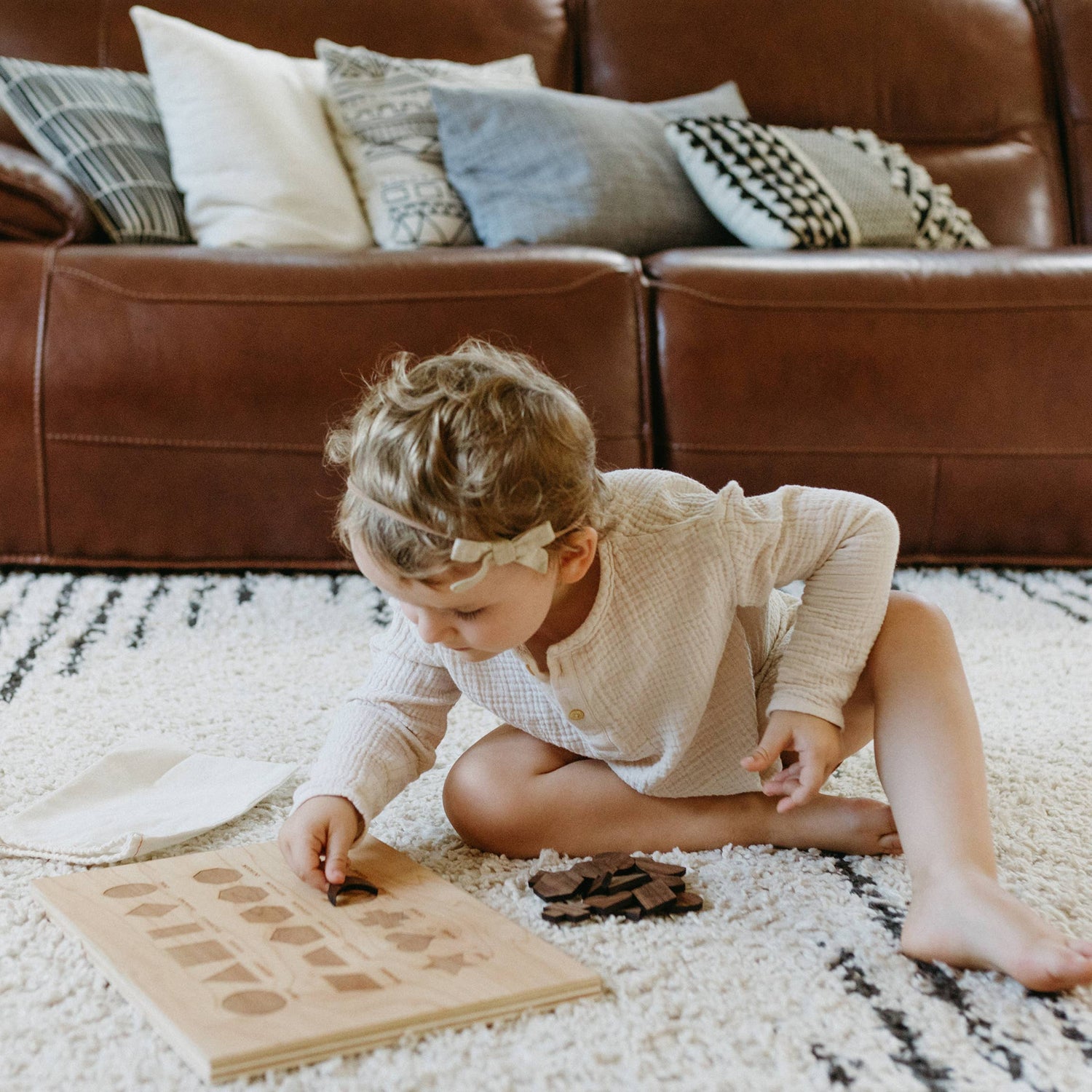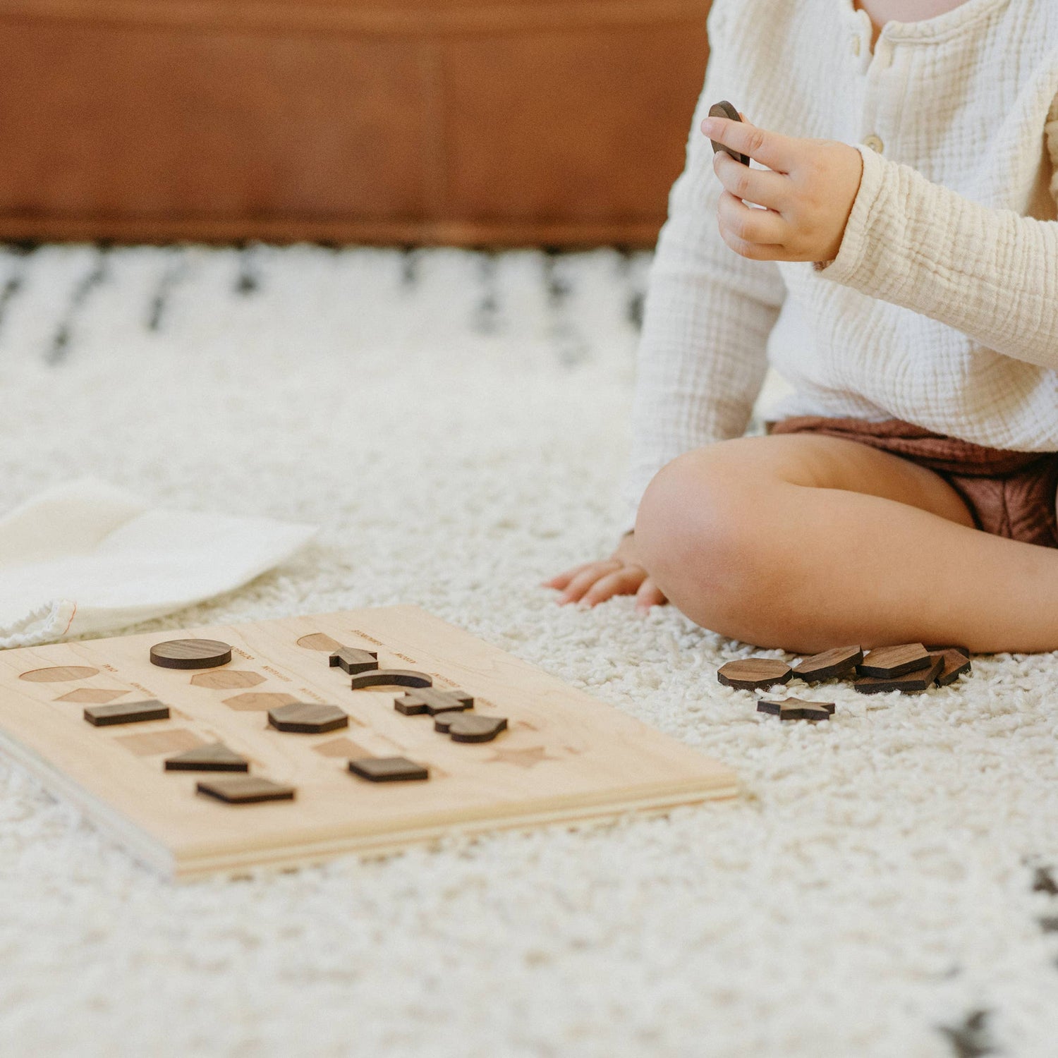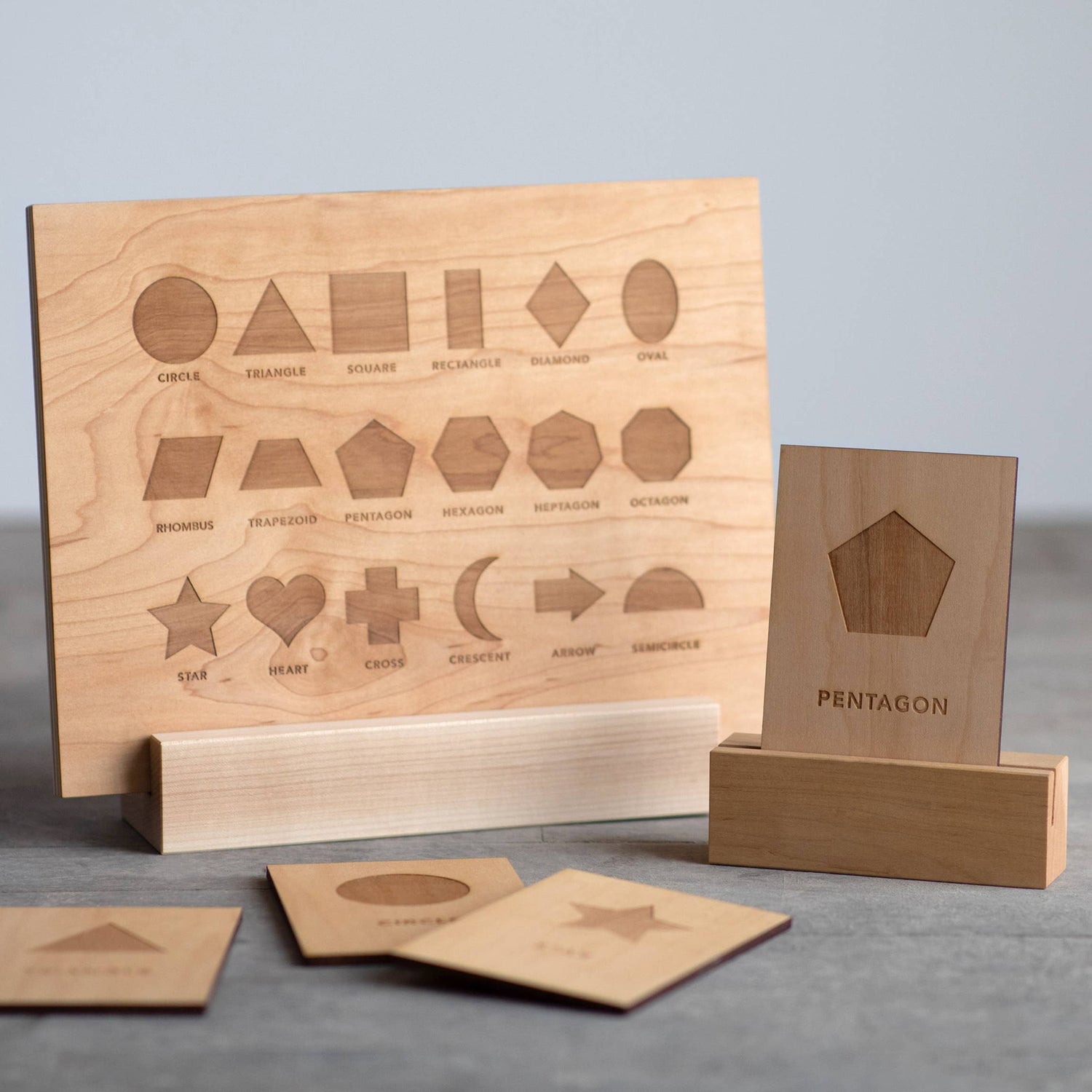 Our handmade wooden shapes board with coordinating wood shape pieces is designed with multiple uses in mind - as a matching activity & puzzle for little hands, shape pieces for geometry practice, tracing, and exploration, & as an art display. Inspired by Montessori-style natural materials, this engraved board allows children to trace their fingers in the grooves of the wood & feel each shape while absorbing the beauty of each form in this crisp, clear, easy-to-read chart. Our design features 18 basic shapes and their corresponding names, and all 18 shapes cut out in contrasting walnut wood pieces INCLUDES: • Shapes Board • 18 Shape Pieces in a Cotton Bag Crafted by hand their our Ohio studio from locally sourced wood. Sealed with food-grade mineral oil and safe for babies & children to enjoy. Made from plywood, maple, & walnut woods. Each item is unique and made-to-order; wood tone & grain will vary from piece to piece.